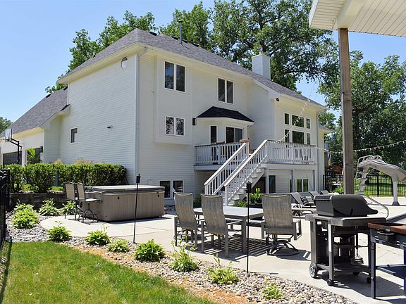 Oasis in Wynstone! This 1.5 story home has 4 bedrooms, 3.5 bathrooms, heated 3 car garage, heated in-ground pool with pool house all sitting on a 1.34 acre lot on a cul de sac with the nature preserve behind. Enjoy watching the deer and eagles while you listen to the sound of the willow trees. Exterior remodel in 2023 included paint, high impact shingles, cedar columns, and tree removal. The backyard is sure to please with the in ground heated saltwater pool with slide & diving board, new pool cover 2025, hot tub, and the pool house with bunk area, kitchenette, half bath and seating area. Entering the front door is a foyer with 13 foot ceiling, hardwood floor and chandelier. The hardwood floor continues in to the formal dining with french doors (or could be office). The living room has so many great features including the electric fireplace with statement surround and shelves, large windows overlooking the back yard, the 13 foot ceiling and gorgeous chandelier. The kitchen has a dining area with slider to the composite deck, hardwood floor, white cabinets, solid surface counters, SS appliances, (gas stove & double ovens) and large pantry. Laundry room is nearby and has tile floor, closet and sink. Master bedroom is on main floor and has LVP, electric fireplace with statement surround, chandelier, and 6x6 WIC with built ins. Master bathroom features heated floor, separate vanities, tile shower, jetted tub and a toilet room. A half bath with hardwood floor completes the main floor. Upstairs are 3 bedrooms, a shared full bathroom between 2 of them as well as hall access. The surprise up here is a theater room! This is where everyone will want to gather to watch movies or games. The lower level has more fun spaces with a family room, game table area, wet bar with seating area, a full bathroom, and a room for gym equipment/storage. New FAG/AC in 2023. Open enrollment available to Dakota Valley schools.