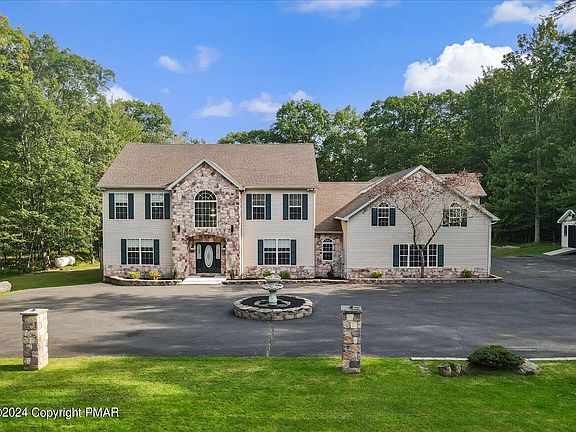 EXQUISITE! RARE 5BR 4.5BA WITH 1ST FLOOR MASTER SUITE ON 3.16 PRIME, PRIVATE ACRES! YOUR PERFECT ''POCONO PARADISE'' HOME OR RETREAT. ALSO INCLUDES AN INCREDIBLE 28 X 44 FAMILY/REC ROOM W/SEATED WETBAR. 1320 SF 4 CAR (HEATED AND COOLED) GARAGE & STORAGE SHED. NICELY LANDSCAPED WITH HUGE PAVED DRIVEWAY. INGROUND, OVESIZED 18 X 44 POOL WITH BRAND NEW LINER! LANAI AND TIKI HUT W/WETBAR. HUGE (FRESHLY REDONE) SEATED DECK. BRAND NEW 48FT PAVER PATIO. INTERIOR HARDWOOD FLOORS NEWLY REFINISHED, FRESH PAINT AND FIXTURES THROUGHOUT, NEW WINDOW DRESSINGS, UPGRADED CHEF-STYLE KITCHEN WITH ALL NEW TOP-SHELF APPLIANCES. RECENTLY SERVICED 4 ZONE HEATING AND COOLING SYSTEM. CRAWL SPACE NEWLY ENCAPSULATED. BRAND NEW ROOF 9/24!! YOU COULD NOT BUILD THIS INCREDIBLE HOME AT THIS PRICE. SEE IT FAST.
