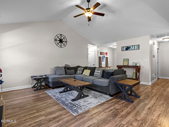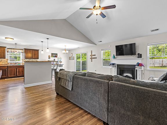 Welcome to Rockford Forrest! This stunning community is perfectly positioned in southwest Jacksonville, mere minutes from the air station and a short drive to Camp Lejeune and Stone Bay. Upon entering, you're greeted with soaring vaulted ceilings in the living room, a cozy fireplace, and beautiful flooring that spans the open-concept living area. The kitchen boasts an L-shaped island with ample counter and cabinet space. Down the hall, you'll find the master bedroom, featuring a tray ceiling and an expansive walk-in closet. The master bathroom includes dual sinks, a large shower, and a separate tub. The conveniently located laundry room provides additional storage space. Two more bedrooms share a full hall bath. Outside, a patio awaits where you can enjoy summer evenings. This 3-bedroom, 2-bath home even comes with a privacy fence, offering everything you're looking for and won't last long!