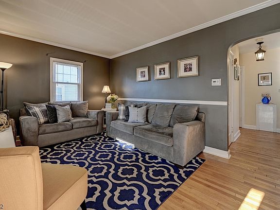 Step onto the rocking chair front porch & enter this adorable home! Hardwood Floors and crown moldings compliment the first level. Charming kitchen w/breakfast nook & stainless steel appliances! Formal dining room with extra closet space! Upstairs you will find the master bedroom with a bright and sunny full bathroom and the 3rd bedroom. A full finished basement boasts a spacious family room with a built-in bar, updated flooring and recessed lighting. A sliding door from the dining room brings you to a lovely, fenced in yard with a deck. Detached garage with long driveway and plenty of space for extra cars. Added bonus is the neighborhood! Great location across the road from a public, tree-lined park and playground! Furnace 2019 and HWH 2018.