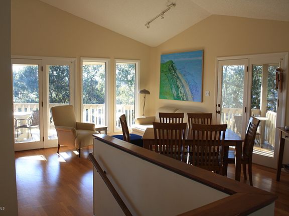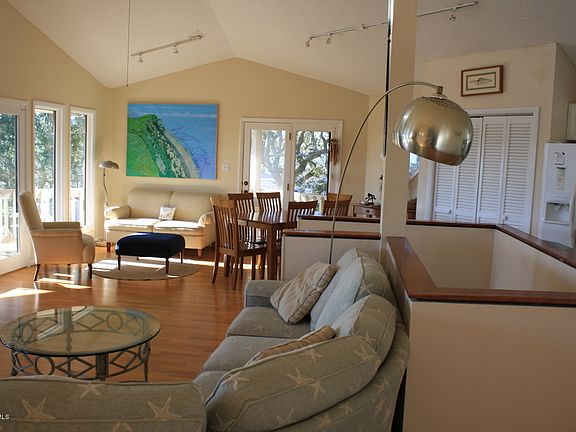 Very unique floorplan for this 1/2 duplex (North side) designed privacy in mind. Not your typical shared-wall design! 2nd row to the Inlet. Three BRs/two BAs & fully furnished. Hardwood, tile and laminate wood flrs. Open greatroom with high ceilings & extra glass allow for lots of natural light & views of the surrounding live oaks. Covered porches.Separate private entrance as well as a common entrance. Sewer: Shared w/South