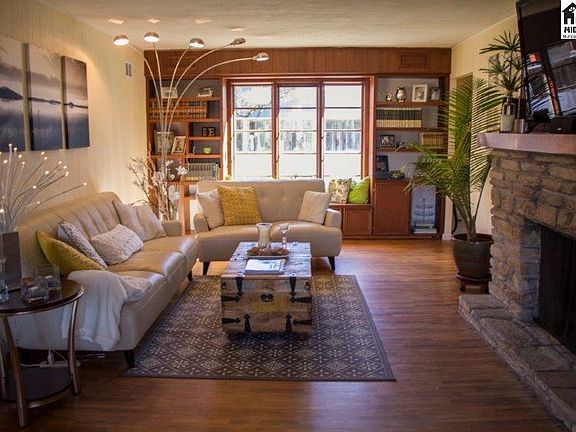Tucked away on a private drive, this 3 bedroom 2 bath ranch style home is the perfect place if privacy is a must! From the hand carved double door entry to the stone wood burning fireplace plus original wood floors, you'll enjoy a certain cottage nostalgia. Also, the living room boasts a built-in bookcase that surrounds a large window complete with a seat that overlooks the back yard. The kitchen offers modern conveniences including a stainless steel appliance package along with a large pantry. Both bathrooms have recently been updated...the main shower offers multiple body jets for a spa like experience. The formal dining room is light filled offering a view of the front yard. A major attraction is the lower level. It sports a 2nd fireplace & comes complete with a projector, screen & furniture to relax on while watching your favorite movie! The yard space is amazing & offers a shed perfect for toys & tools. Being within walking distance to a park & school makes this home a jewel!!