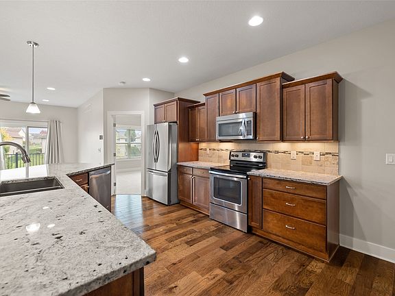 Rarely available and better than move-in ready, this stunning 3-bedroom, 3-bath walkout ranch townhome offers over 2,550 sq ft of beautifully finished living space and backs to a serene 4-acre pond. Thoughtfully updated and meticulously maintained, this home features new HVAC, A/C, and water heater (2025), a new roof (2021), a new refrigerator (2025), and a new Trex deck (2024) for worry-free living. Step inside to find fresh interior paint and new carpet throughout the main level. The spacious open-concept layout includes a kitchen designed for entertaining, complete with granite countertops, stainless-steel appliances, tile backsplash, hardwood floors, and soft-close dovetail drawers. The adjoining great room showcases a corner fireplace with a brick insert and blower for cozy nights in. The primary suite is a private retreat with a double vanity, granite shower, and a large walk-in closet with custom wood shelving. The finished walkout lower level adds a generous family room, additional bedroom, full bath, and abundant storage. Built with 2x6 construction, this home blends quality, comfort, and unbeatable views. These townhomes rarely hit the market, so don't wait to make it yours! All information obtained from seller and public records.