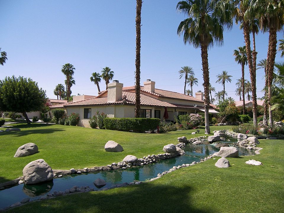 Park Palms is a hidden development in the heart of Palm Desert that feels like a secret tropical island surrounded by pristine blue lakes and creeks, cascading waterfalls, lush landscape, in a small secluded quiet development and amazing Mtn. Views with all the amenities you need: tennis courts, pools, spa, active Clubhouse and exercise room. This end unit on a quiet cul-de-sac, is a clean 2BD/2BA, with fireplace, 2 car garage, 2 lovely patios (the front private courtyard overlooks gorgeous Mountains, and the back patio overlooks a tranquil, serene creek with morning sun), wet bar, very bright, plantation shutters, ceiling fans. The Bedrooms are located on opposite ends so it's very private. Located across from exclusive Marriott Hotel, Golf is just few minutes at the Desert Willow CC, great classes at College of the Desert, culture at McCallum Theater, museums, and near to the exclusive El Paseo (shopping, fancy restaurants, Art Galleries). This is the lifestyle you want.