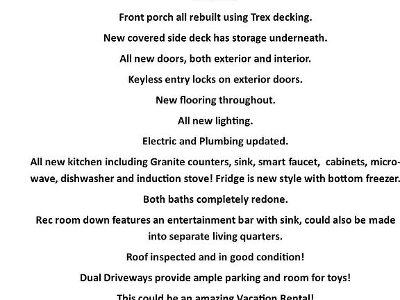Stunning remodel on this 3BR/2BA home! All done in the past few months: siding, windows, Heat Pump, kitchen and baths, flooring, lighting, electric, pex plumbing, and more! The gorgeous kitchen features updated appliances, (including a radiant heat stove!!) granite counters, cabinets and a smart faucet! New LVP floors throughout the home, except at foyer, find beautiful tile floor there and new front door. Check out the new steps and railings! Trex Decking there! Enjoy the open floor plan of this home making it great for gatherings! Wonderful covered side deck off of the kitchen for relaxation. Downstairs find the rec room with plenty of space for entertainment with a wet bar, entry to left side covered area and yard. All downstairs doors are solid wood. There is a large bedroom downstairs as well as a big bath. This could also be a separate living quarters! The septic was inspected and pumped in November of 2022. All doors are keyless entry. Dual driveways are a big plus if you have toys! The yard is level with a fire pit out back. This home is a must see!! Location is fantastic being close to Frozen Head State Park, Windrock Park and just 20 Minutes to Oak Ridge!!! Buyer to verify all information.