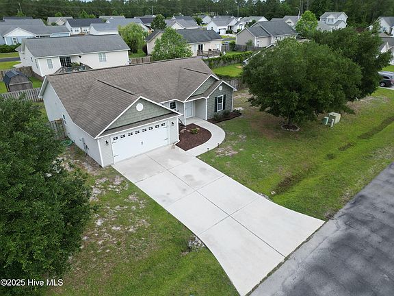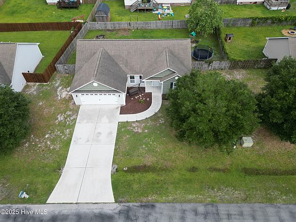 This charming single-story home features 3 bedrooms, 2 full bathrooms, and an open-concept layout designed for comfortable living. The spacious living area is filled with natural light and flows seamlessly into a cozy kitchen and dining space. A large sliding glass door leads to the backyard, where the outdoor area has recently been expanded—doubling in size and offering the perfect space for entertaining or relaxing. **Seller has a trampoline in backyard which can convey at closing or be removed** The private primary suite includes a walk-in closet and an en-suite bath with dual vanities. Located in a welcoming neighborhood just minutes from Surf City beaches, Camp Lejeune, and Hwy 17 for quick access to Wilmington and Jacksonville. Motivated seller offering 5k in concessions! Don't miss this move-in-ready home that perfectly blends convenience, comfort, and coastal living. Schedule your showing today!