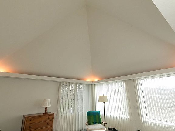 ARCHITECTURAL MODERN DESIGN with light-filled rooms and expansive windows capturing river views. The flawless wood flooring, smooth walls and dramatic peaked ceilings compliment this stunning contemporary home. Open, entertaining area with living room highlighting fireplace with granite surround, dramatic dining room and library with built-in bookcases. Spacious eat-in kitchen with stainless appliances, built-in buffet and quartz counters; private master suite with marble bath, walk-in closet and views.
