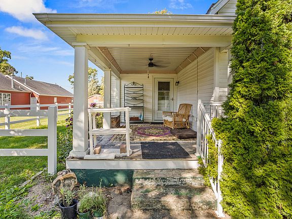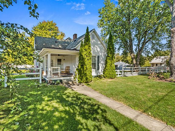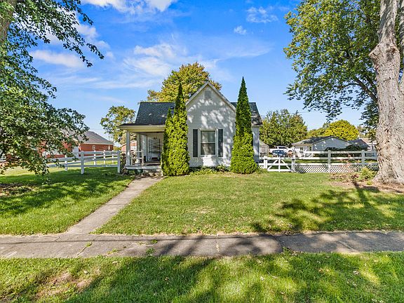 Charming ranch home on a spacious double lot with fantastic curb appeal! Featuring a classic white exterior, fenced yard, and a welcoming front porch, this 2-bedroom, 1-bath home blends character and function. Inside, you'll find a large separate dining room, a functional kitchen with a cozy breakfast nook-currently set up as a prep station, perfect for canning and preparing fresh produce from the gardens. The detached 2-car garage offers updated electrical. The backyard is truly a homesteader's dream with a greenhouse, small deck and patio, four flowerbeds ready for planting, and an abundance of established gardens. Nearly everything grown on the property is edible, from vegetables to over 100 flowers and herbs used for natural remedies and teas. A unique opportunity for garden lovers and anyone seeking a peaceful, productive lifestyle.
