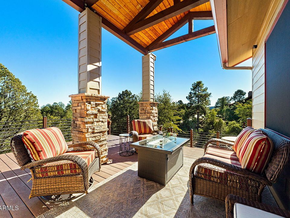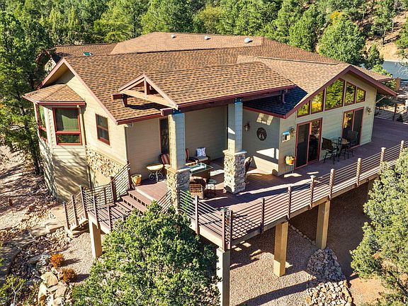 Escape to refined mountain living in this spectacular custom single-level residence, now offered as a double lot including the .37 acres next door, perfectly positioned in an intimate private gated community of only 20 estate-size lots. Enjoy unparalleled tranquility, exclusivity, and breathtaking Rim mountain views. This home delivers the ultimate connection to nature while surrounding you with uncompromising comfort and craftsmanship. Step inside to discover an elegant blend of timeless finishes and thoughtful upgrades. Brazilian Tigerwood flooring (refinished in 2025), brand-new carpet, fresh interior paint, rich wood-stained windows and doors, skylights, and three luxurious copper sinks create warmth and character throughout. The expansive great room centers around a cozy propane fireplace and flows effortlessly to over 1,500 square feet of low-maintenance Trex decking, perfect for soaking in panoramic mountain scenery, lush pine views from every window, and unforgettable sunrises. With outdoor spaces designed for year-round enjoyment and a fenced yard with dog run, this property truly embraces four-season living. The chef's kitchen is equipped with high-end appliances including a brand new Sub-Zero refrigerator, complemented by a convenient wet bar with a brand-new beverage fridge, ideal for entertaining. A spacious office features custom cabinetry, granite countertops, and a built-in Murphy bed, making it the perfect dual-purpose space for guests or work-from-home living. The generous master suite is a private retreat with a beautifully finished master closet offering extensive built-ins and storage. Additional highlights include on brand new (1 year old) roof with a 50 year warranty, 2 propane fireplaces, central vac, extensive storage throughout, a large 1,000 sq ft epoxy-coated garage with cabinetry and workbench, lightning protection system, propane BBQ hookup, and professionally landscaped, low-maintenance grounds. Just outside the prestigious Rim Golf Club and Chaparral Pines where non-resident memberships are available you can enjoy world-class amenities while retreating home to serenity. Whether you're seeking fresh mountain air, cooler summers, or a peaceful luxury escape, this extraordinary property delivers unmatched privacy, sophistication, and natural beauty. Welcome to your mountain sanctuary.