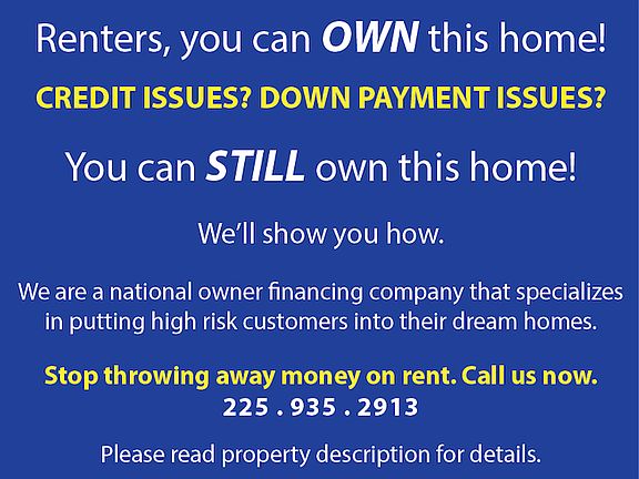 This property is available on a rent-to-own basis.DON'T WASTE MONEY ON RENT. EASY OWNER FINANCING AVAILABLE! You may be able to own a home even with bad credit. This 3 bedroom, 2 bath home is only $99,900. Principal and interest payment approx $725.00 a month. Easy owner financing with only $2,000 down, a good rental history and stable employment. Call today 225- 935- 2913. All approvals subject to underwriting guidelines. Interest rate is not guaranteed. Application based on credit and income history, insurance, and other costs. APR's and loan amounts may vary at any time based on applicant's qualifications and market conditions. Application fees may apply. Taxes and insurance are estimated. APR 7.9%. HS Property Owner, LLC Highlandia Dr. Ste A Baton Rouge, LA 70810.