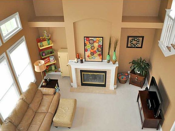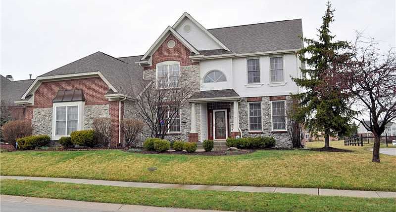 Attractive Stone and Brick Home in Carmel with great open floor plan on the pond in Spring Farms! Two story entry & 9' ceilings lead to 2 story Great room w/loads of windows, open to kitchen w/tile, low maintenance solid surface countertops, smooth cook-top & breakfast bar. Main level master, garden tub & separate shower. Three additional bedrooms + large loft upstairs. Finished basement w/full bath. Great views from the main living areas. Newer lower maintenance HardiPlank exterior siding.