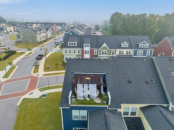 Immaculate custom built Ella floor plan, end unit townhome with 3rd floor rooftop terrace. One of the premier townhomes in Wake Forest situated on a 36-foot-wide lot providing extra SF in both the home and yard. Enjoy sitting under the custom-built pergola on the rooftop terrace with the spectacular views. The wooded area behind the townhome provides excellent privacy. This green living certified townhome has an open floor plan with an upgraded eat-in kitchen, stainless steel appliances, marble countertops, soft close cabinets and high-end Electrolux dishwasher and oven. Imported white brick, accents the walls throughout the main living area. Engineered hardwoods on first floor. Owners’ suite comes with a tray ceiling, upgraded bath, and large walk-in closet. Plantation shutters throughout the home. Located in downtown Wake Forest and walkable to bars, breweries, dining, and entertainment!!