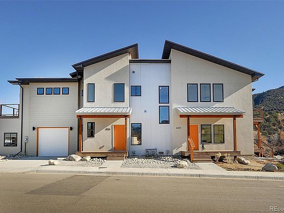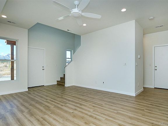 Contemporary design in Two Rivers! This chic town home was designed by Keith Zoni and shows attention to detail from the additional storage space created in the garage to the thoughtfully placed Smart Sun windows that let in gorgeous views without harmful UV rays. This property is on the east end of Two Rivers, close to the subdivision's gazebo by the river. Take in the Collegiate Peaks from your primary bedroom balcony! High efficiency furnace and tankless hot water. With nine foot ceilings throughout there is a spacious quality -this is not your typical long and narrow town home! Enter the home into the open concept living, dining and stylish white kitchen with stainless appliances, a generous island for work space, sleek quartz counters, and clean subway tile. There is also a conveniently located half bath tucked around the corner from the living area.