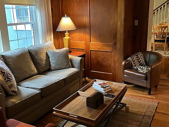 Gracious home features fireplace in living room, 2 bedrooms with full bath or den & bedroom on main floor, dining room, kitchen, laundry & 1/2 bath. second floor newly remodeled bathroom, 2 bedrooms (one currently tv/office). Garden areas, carport and shed. 24 x 28 garages with 2 finished rooms above.