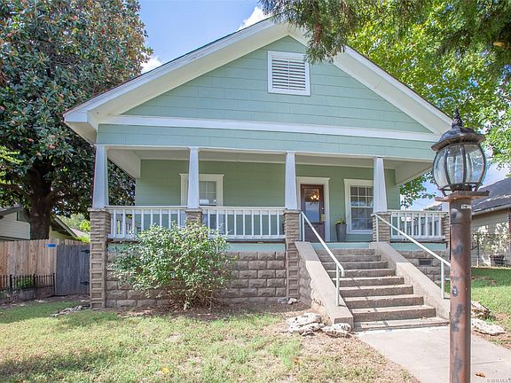 A 1920's bungalow in the heart of downtown Sand Springs w/an amazing front porch! This remodeled home is move in ready. With 3 bedrooms, 2 living areas, formal dining, kitchen & indoor laundry this home has plenty of space. The kitchen boast stainless steel appliances, ceramic tile counter tops & floors. Nice indoor laundry room w/adjoining half bath. Newer roof, windows, fresh paint indoor & out, new carpet & vinyl wood floors. Nice private back yard w/paverbrick patio. Off street parking from back.