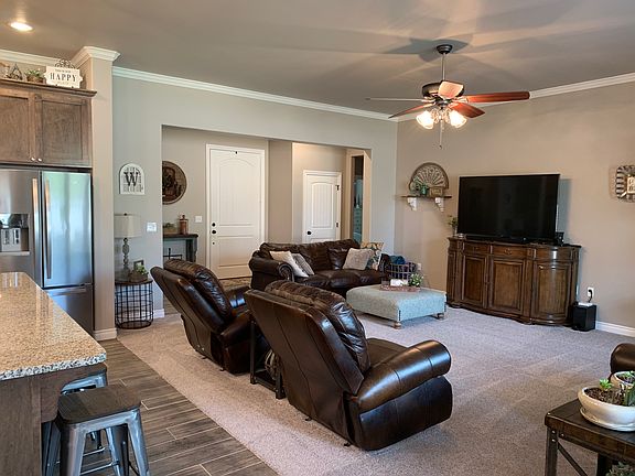 Beautiful home in a great, quiet neighborhood. Three bedroom, 2 1/2 baths, upstairs bonus room, 3 car garage with in-floor garage storm cellar. Open floor plan. Gorgeous kitchen with large center island. Plenty of cabinet and countertop space. Spacious living room with floor to ceiling rock fireplace with gas logs. Large powder bathroom. Laundry room is generously sized with shelves for storage, cabinets, built in pull-out hampers and a sink. Master bedroom with master bath that includes a jetted tub and walk-in shower; also has a walk-in closet. Stained wood work, maple cabinets, granite countertops, and wood-plank tile floors. Gas heat. City utilities. Cedar fence enclosing the back yard. Gorgeous landscaping with sprinkler system. Shops allowed.