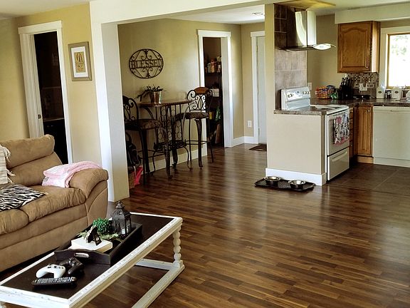 New roof, HVAC system, ducts, water heater, flooring, kitchen, bathrooms, windows, electrical, lighting, well, and siding as of 2014. The kitchen and living room are open concept. The master bedroom has a walk in closet and master bath. All appliances stay with the home except washer and dryer. Washer and dryer staying with home is an option. Garage is heated and has a bar for entertaining. There is also a shed in the backyard next to concrete slab for up to 3 cars to park.