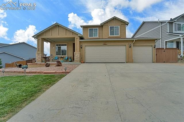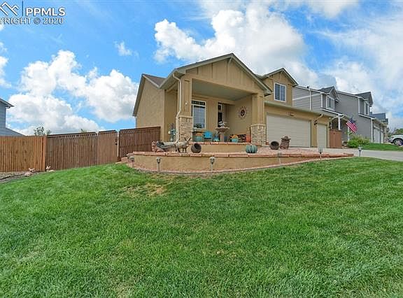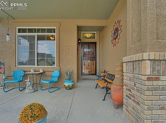 WOW! LOOK NO FURTHER! This is a beautiful 4+3+3 stucco home in The Knolls at Spring Ranch. 2 story home with over 2600 square ft, lovely touches and accents throughout, finished basement w/walkout and 400+ sq ft deck with retractable awning and amazing views. Upgraded kitchen boasts newer slate appliances, island/counter combo, granite counter tops, walk in pantry, gas/electric option for stove, but presently with gas stove. Ceiling fans, crown molding, 6 panel doors, modern versatile window treatments throughout home. Attractive covered porch, marble stone entry, spacious office, A/C, humidifier, ample storage areas, inviting living room all add to the comforts and many options to suit your future needs. Complete landscaping includes auto sprinklers, stamped concrete, enclosed rear fence, grass areas in front and back. Master Bedroom with cathedral ceiling, walk in closet and adjoining 5 piece bathroom, is located upstairs in proximity to two bedrooms and a full bath. Central to all military bases, close to shopping, parks, trails and Powers Corridor. Please schedule your showing and witness this pride of ownership! You won't be disappointed!