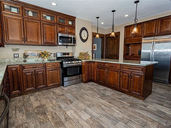 Looking for that large farmhouse on a hill complete with a wrap-a-round porch and two staircases? This is a must see. With over 2500 sq. ft., this home has 4 bdrms and 3 full baths. Inside you'll love the hardwood floors, natural woodwork, pocket doors and charming built-ins. The first floor has a large dining room, open foyer, laundry and living room/den. The kitchen is a dream! Completely new in'16, with Niagara cabinets, granite countertop, heated tile floor, breakfast bar, and brkfst nook that looks out sliding glass doors to deck(new in '18). First floor also has a bdrm and full bath, that could be used as a master, in-law or guest suite. The 2nd floor has 3 bdrms and 2 full baths, also with a very large master suite and both bathrooms completely re-done, new carpeting and freshly painted throughout. The roof was a tear-off '07, there is a tankless h/w "16, 200 amp electrical service wired for generator, google thermostat, and public water. Outside you will find a 3 car garage and did I mention grapes, apple, pear and cherry trees? All this on a quiet country parcel but still within minutes of shopping and thruway. Delayed negotiations until Monday 2/21/22 at 4:00 pm.