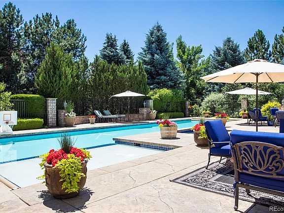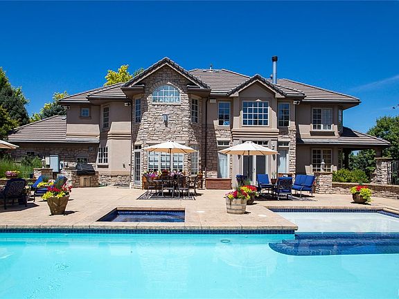 Welcome to this elegant, grand retreat in the Preserve in Greenwood Village, nestled on private beautifully landscaped grounds. The exceptional curb appeal, custom upgrades, exquisite craftsmanship and resort style backyard with pool truly takes this home over the top! It's the perfect home for entertaining family and friends and creating lasting memories. Special features include: a private backyard oasis with huge gorgeous pool with shallow tanning shelf, recreation zone and lap pool all rolled into one, in ground spa, large gas fire pit and outdoor kitchen and barbecue. You will also love the mature landscaping, stone walls/columns, pretty iron fence and massive stamped concrete deck - perfect for the largest of gatherings! The grand two-story entryway with two gracefully curved staircases creates a visual masterpiece. The kitchen is a chef's dream with two islands, custom cabinets, walk-in pantry, and high-end appliances. The kitchen seamlessly opens to the grand two-story family room, complete with an impressive cast stone fireplace. The elegant dining room features wainscoting, custom light fixtures, and butler's pantry with wine cooler. The private study opens to a covered side porch and features beautiful custom shelving, built-in desk and coffered box beamed ceiling. The formal living room features a handsome cast stone fireplace. The primary suite is a true sanctuary with a lovely cast stone fireplace, sitting area, coffee bar with beverage fridge and a luxurious 5 bath with a huge wardrobe closet. Secondary bedrooms each en-suite with full bathrooms and walk-in closets. The finished basement is a delightful bonus with impressive wine cellar, kitchenette, rec room and more. Additional special features include a children's play area, side yards on each side of the pool, circle driveway, 4-car garage, updated custom light fixtures, beautiful wood moldings/trim throughout, and two powder rooms on the main level.