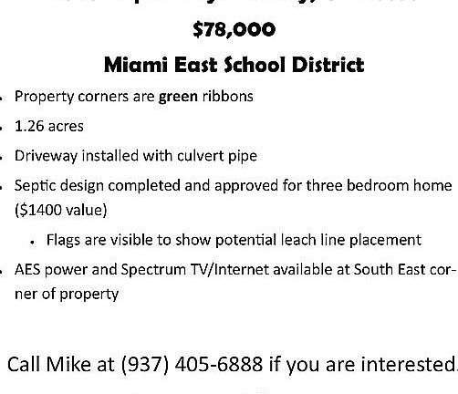 Ready to build lot located in Miami East School District. Driveway installed with culvert pipe. Septic design completed with potential leach line placement marked. AES power and Spectrum TV/Internet on site. Don't miss this beautiful country lot that's only 4 minutes to I-75!