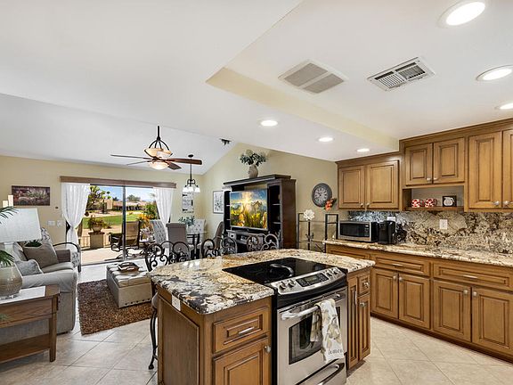 This Very Spacious Home features Vaulted Ceilings w/ Golf Course views and includes an attached 2- Car Garage. The Highly upgraded Kitchen boasts Stainless Steel Appliances & Luxurious Granite Countertops which flow up the entire Backsplash. The Very Large Primary Bedroom with Customized Walk-in Closet has access to the patio as well. Solar tubes add to this light & bright living space. Relax & Enjoy the Eastern Views that overlook the 11th hole on the Fairway. Once you see this home you will never want to leave! Home is offered Turnkey furnished per inventory. The Gated Community of Palm Desert Resort Country Club has a 24 hour guard on duty and amenities include 20 Pools and Spas, Clubhouse and Restaurant, Tennis, Bocce Ball. Dues include Cable, Internet, Trash & exterior pest control. Short Term Rentals Allowed!