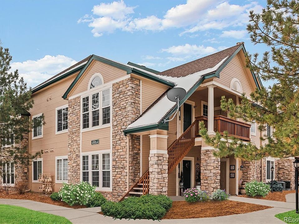Welcome home to this light, bright, newly painted 2nd floor unit in Meadow Hills! Low maintenance living at it's finest! The open concept kitchen, dining and living space with vaulted ceilings is bright and inviting. As you enter, the large windows bathe the main living room with natural light and overlook beautiful, mature trees and a grassy common area. On cooler days, cozy up to your gas fireplace in the spacious living room. The large primary suite has vaulted ceilings as well and includes a full bathroom with double vanity and two large closets. An additional bedroom and spacious bathroom are down the hall to create added privacy and separate bedroom spaces. In-unit washer & dryer included. This unit, unlike many of it's neighbors, has a single car detached garage to protect your car from the elements. Highly rated Cherry Creek schools.