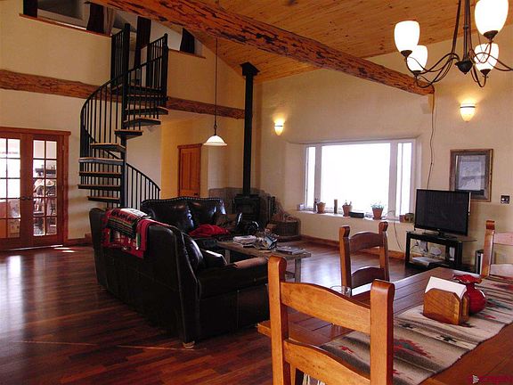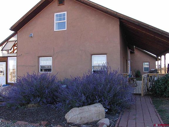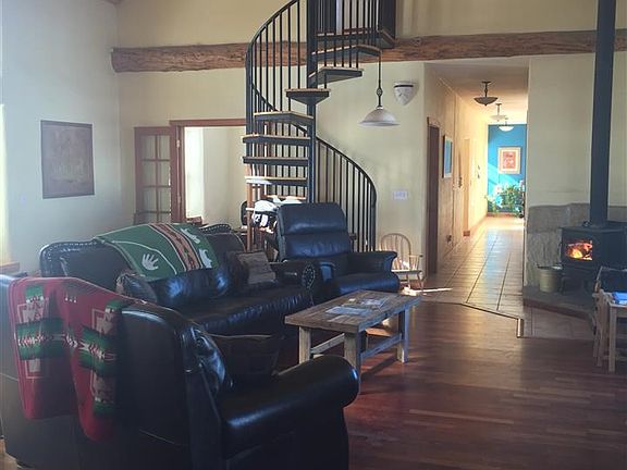 Unique and lovely 2760 sq.ft. post & beam home on 43 ac. Enjoy the amazing sunsets from this home with an attached greenhouse which also contributes to the passive solar heating. The home has 3 bedrooms , 2 1/2 baths, the kitchen is open to the vaulted living room with aspen ceilings and accent log beams. The office is through glass French doors off the living room and above, overlooking the living room is a 288 sq.ft. loft. In-floor radiant heat as well as a wood-burning stove keep this efficient home warm in the winter and it's kept cool by the ceiling fans in the summer. They have 40 shares of the Big Stick Ditch for gravity irrigation for the pond and pastures. Last year produced 36 round bales of hay. This is a terrific horse property with a round pen, improved fencing -- separate pastures to rotate livestock, and seasonal pond. When drilled the well produced 6 gpm, there is an 1800 cistern plus another 1800 gallon cistern to hold runoff water from the roof and gutter system for watering the yards and gardens.
