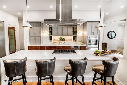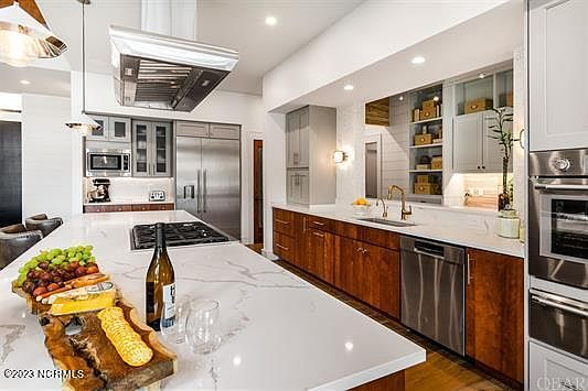 The true size of this home unfolds as you enter the grand foyer through the custom mahogany door and gaze upon the open layout with an impressive wall of windows to capture astounding water views.  The first level features an expansive Great Room with majestic 15' tall ceilings and architectural beams, Chef inspired Kitchen, elegant Dining Room, (3) bedroom suites including a private Owner's Wing with luxury bath, and oversized All-Seasons Terrace Room that is perfect for entertaining with wet bar.  Enjoy true indoor-outdoor living with retractable glass doors and automatic phantom screens that open to the custom pool with fire & waterfall feature, built-in, outdoor, circular dining with gas firepit and lush lawn.  Made for the boater and water enthusiast, you will enjoy the pier with covered dock complete with double jet ski lift and separate boat lift. The stunning second level features three additional guest rooms, meditation room, recreational room with incorporated theater and bonus space which is perfect for a home gym.  Feel as if you are floating above the water with breathtaking, panoramic views from the third level game room complete with wet bar. Luxury details and finishes abound throughout this one-of-a-kind estate, built for resort style living and entertaining.  No detail was spared in creating a true masterpiece.  Don't let this unique opportunity to own one of the finest homes on the Outer Banks pass you by.  Schedule your private tour today!
