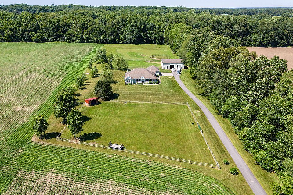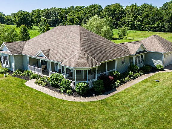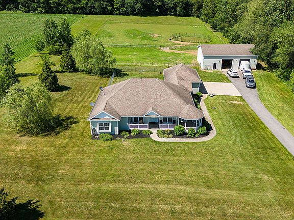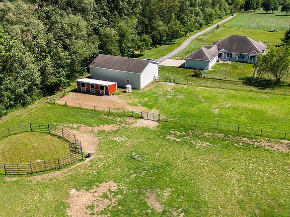 Welcome to a serene retreat set back from the road with paved drive on a 5-acre lot offering a perfect blend of tranquility & convenience. Charming 3 bed 3 bath home boasts modern updates, wraparound front porch, gas fireplace, open concept living, kitchen pantry, main floor laundry, & 3 car attached garage. Full basement with 9 ft ceilings, workshop area, & plumbed for bathroom. Back porch with fenced area overlooking 2 of the 3 pastures. 36 x 50 concrete floor pole barn with tack room & plenty of storage including a hay loft. 3 stall barn with electric & water for your equine companions. A run-in shed provides additional shelter for livestock or storage. Zoned for 3-4 horses & all pastures have electric fencing. High speed fiber optic currently being installed & available this summer.