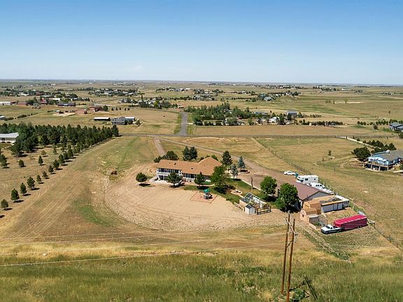 Wonderful ranch style home with many unique features on 5 acres just south of I-70 between Watkins and Bennett. Live in the country w/ easy access to the city and DIA. 4 bedrooms including a wonderful master suite w/ sitting area, access to the back deck, 5 piece bath, and free standing gas stove. 5 bathrooms, 2 with unique and nostalgic decor. Large over sized deep 3 car garage w/ heat and accessibility to the basement. Wonderful southern light filters into the home on both the main floor and walkout basement. Laminate flooring throughout main floor, see through gas fireplace in living room, new southern windows, pull out spice racks in kitchen, washer, dryer, hot tub, and deck access from 3 of the bedrooms. Basement has an additional kitchen with frig, stove, and microwave. Large 40 x 40 outbuilding/workshop w/ heat, concrete floor, and openers. 3 additional utility sheds, 2 w/ electricity and loft areas. Enclosed garden area and additional pressure tank for sprinkler system.