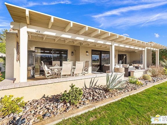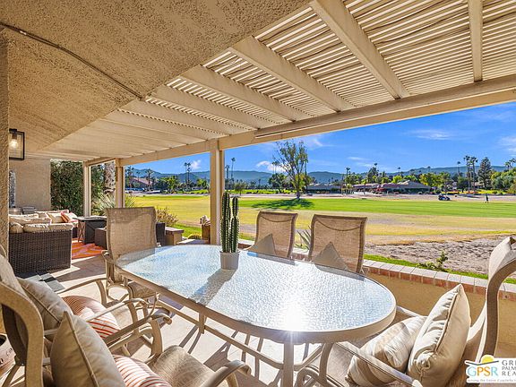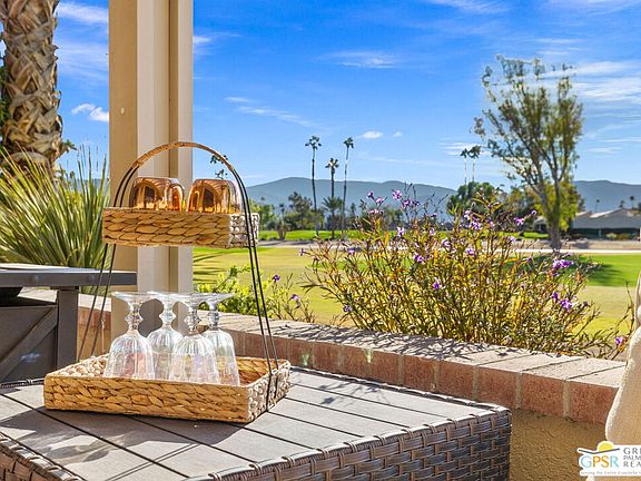 Introducing this exquisite Vintage Model showcasing panoramic views of both the mountains and the expansive 10th fairway. Southwest facing location with the Cafe, Clubhouse and 2 salt water pools/spas just a short walking distance away.. As you enter, you'll be welcomed with warm color tones with natural light that fills the space. Enjoy cooking and entertaining in the open kitchen with stainless steel appliances, granite countertops, and an ample-sized peninsula for added counter space and eating. The breakfast bar seating has plenty of cabinet space for your storage needs. The vaulted ceilings in the open concept living room make this home feel spacious and welcoming. Intelligent floor plan with owner's suite and bath is on one side of the home, and guest bedroom and bath on the opposite side, which is perfect for privacy and separation, and makes this one of the most popular models. Both bathrooms have quality finishes and have a complementary design with the rest of the stunning home.Step outside the sliding glass door, and you will see an extended tiled patio with a patio cover and an exterior pony wall for furry friends with sunset views that cannot be missed. A 2-car garage is attached, which is a valuable feature. Exceptional FURNISHINGS included per inventory list! The Palm Desert Resort Country Club has a beautiful clubhouse, Coachella Valley's premier pickleball and tennis club, and an award-winning golf course. The resort is a very active community with a clubhouse (includes formal dining, a lounge, and a pro shop), and 20 pools and spas. The Resorter has a guard gate with 24-hour security. There is proximity to dining and shopping. Desert activities include hiking and biking trails near the resort. The resort is 4 miles from the Indian Wells Tennis Gardens, 10 miles from Empire Polo Grounds, 25 minutes to the Palm Springs Airport, and 2.5 hours to San Diego, Los Angeles, and Disneyland. The resort is a gem and is short-term friendly and the owners have 5-star reviews on two hosting sites. You will be in paradise out on the patio, enjoying the sunset views and resort ambiance! This is a must-see!