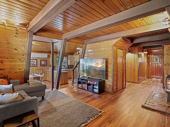Discover your perfect getaway in this modified A-frame cabin filled with rustic charm and thoughtful modern comforts. Featuring tongue-and-groove pine walls and ceilings, this inviting cabin offers ample living space and unique design. The cabin includes a propane fireplace with thermostat and new mini-split system for efficient heating and cooling. Updated dual-pane windows enhance comfort and energy efficiency while custom stained-glass windows add unique character. The open kitchen flows into the living area with a separate laundry/mud room with its own entrance.