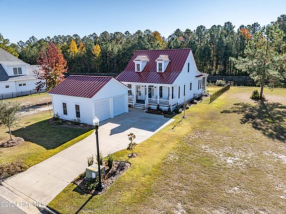 This amazing custom-built home by Mike Maher, nestled in the highly sought-after Commons in Carolina Colors, is truly a masterpiece! The attention to detail is evident in every corner, from transom windows above the doorways, the cozy fireplace in the great room, the charming butler pantry to the built-in benches with extra storage. You will love the first floor primary bedroom with its spa like bath, the first floor office/flex room with a closet and glass french-doors, the den with its natural light and the stunning red metal roof that makes this home truly stand out. Enjoy a nature lovers and birder's Paradise! Whether its warm weather or colder temperatures, you will enjoy the serene wooded setting as you sit in the large private screened porch overlooking the lake. You will love watching deer, Great Blue Herons, Bald Eagles, Egrets, Kingfishers and the wide variety of beautiful ducks that visit Carolina Lake! The wrought iron fence has been professionally installed and tastefully accents the back yard with its wide open lake views. The oversized, full length front porch adds to the quaintness of this chic country-inspired home, as it welcomes you to sit, sip and enjoy a breeze as you rock and relax. Don't miss your chance to experience this one of a kind stylish home, it's beautiful craftsmanship and perfect wooded, lakeside setting!