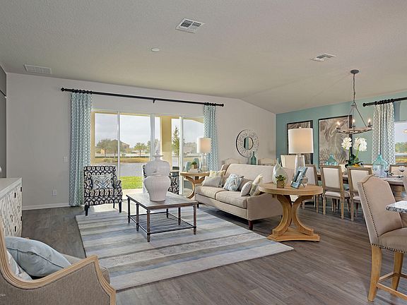 MODEL HOME! This lakefront Amber II has a stone-accented Contemporary elevation and is loaded with upgrades! Spacious, open concept design and lofty 10' ceilings, 12' sliding glass doors open to a 40' x 10' covered porch, all overlooking the lake and gorgeous sunset views! The island kitchen has granite counters and SS appliances. Stylish plank vinyl flooring runs throughout the main living areas of the home. Energy efficient features, storm shutters, and a 2-10 builder warranty make this home a great deal in a new community in sought-after W. Melbourne close-out community. DON'T WAIT - THIS HOME WILL GO QUICKLY!
