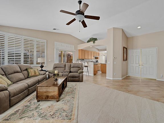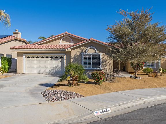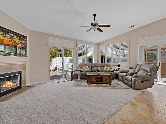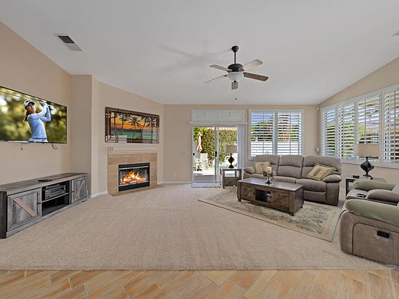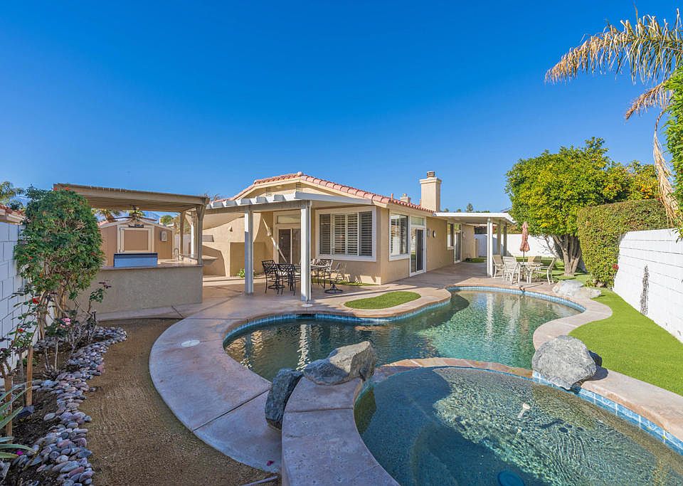 Stunning 3 bedroom, 3 bath pool home on a cul-de-sac home is move-in ready! Enter this updated home into an open floorplan perfect for family or entertaining. Diagonally laid wood-like tile throughout except bedrooms and living area . Large kitchen with granite countertops, stainless steel appliances, large island, wine refrigerator, and breakfast nook area. Greatroom has dual sliders to the rear yard and a tile gas fireplace. The primary suite has double-door entry, slider to the rear yard, and large walk in closet with built-ins. Primary bath has linen storage, dual sinks, large soaking tub and step-in shower. Guest ensuite is on opposite side of the house for your guests and features a large closet with built-ins and rain glass shower enclosure, and dual sink in its bath. 3rd bedroom has mirrored closet doors. Powder room has added tile shower giving the 3rd bedroom a full bath to use. Rear yard has large built-in barbecue island that is covered with sink including hot water heater. Pool has stack-stone spill over. All grass is turf. Dual alumawood patio covers allow for extensive shade as needed. 2 car garage has epoxy floor and built-in storage. Perfect central Palm Desert location, convenient for shopping and restaurants. Furniture available outside of escrow.