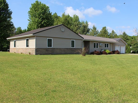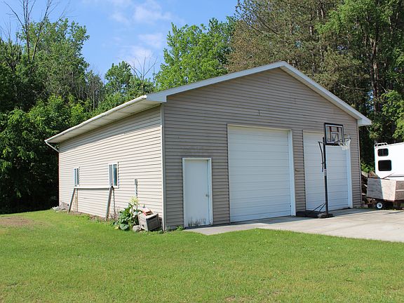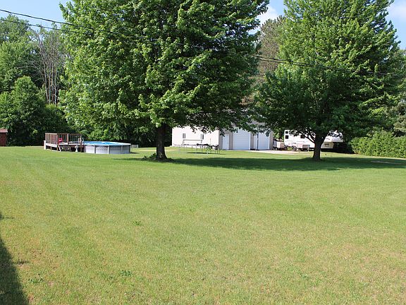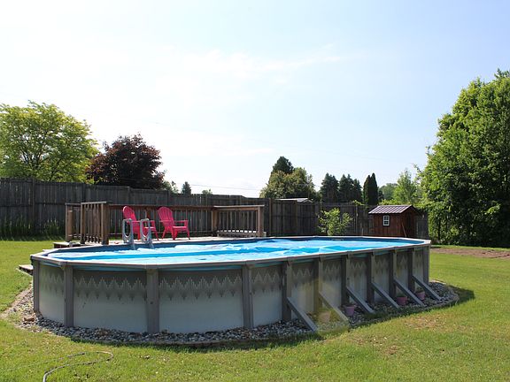 3 bed 1.5 bath ranch style home on 1 acre with attached 2 car finished garage that has a 10x24 workshop in back, has a gas line and vent ducts ready, and is insulated, could easily become a heated garage. Steel roof installed 2014. Pole barn is 32x40 with work benches and storage shelves. The pole barn is wired to back feed house from generator incase the power goes out. 16x32 above ground pool 3ft deep with a 6ft deep end, pump and filter new 2016, liner new 2013. Oak kitchen and oak trim throughout the house. Privacy fence, hedges, and woods border the property. Flat yard perfect for outdoor games and shade for entertaining. Spacious open floor plan. Hot water baseboard heat with an outdoor wood burner keeps house toasty warm in the cold winter months. Plenty of storage space. Laminate wood floors in all bedrooms.
