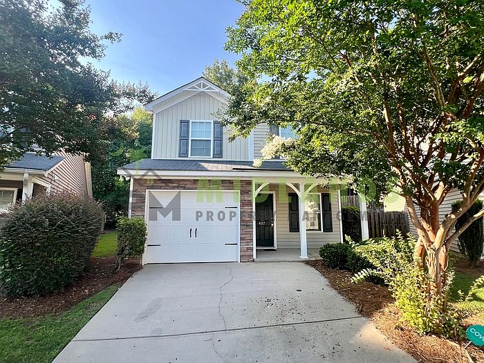 Introducing the residence at 407 Barnet Court, situated conveniently within walking distance of shopping and dining. This architecturally appealing home boasts an expansive open layout that seamlessly connects living spaces, creating an atmosphere of sophisticated yet comfortable living. Approaching the home, one is greeted with an inviting facade that harmonizes neutral color palettes with stonework accents and steep roof lines. The charming covered porch grants a picturesque space to enjoy the tranquil neighborhood setting, while the one-car garage presents convenient and secure parking. Upon entry, the foyer unfolds into the spacious main level featuring a primary bedroom suite. This serene retreat affords ample space, ensuring a peaceful and private atmosphere. Generous natural light from well-placed windows highlights the rooms structural silhouettes, complementing the cohesive flow of the home. Central to the homes allure is the thoughtfully designed kitchen, portraying a harmonious blend of rich wooden cabinetry and sleek stainless steel appliances. Countertops offer a luxurious workspace, while the strategic layout promises practicality and ease for culinary endeavors. Accompanying this area is a convenient pantry. The laundry room and half bathroom complete the main level.