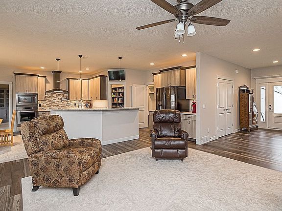 This custom built 3 year old home is a steal. All the extra creature comforts of constant and endless hot water, heated master suite floor, full house automatic switch generator to ensure warmth and cool during any utility disruption, house security that you can monitor while away, 4 individual thermostats for comfort for all, and water treated not only for clean clothes and good mechanical maintenance of all equipment, but osmosis water for your ice and drinking water - no more buying or refilling bottles. All of this, added by the owner, is included at 2019 prices, in a beautiful home with a blend of subtle warm colors, custom window trims and all with cellular shades and a private bonus room! This like new zero entry 3 car garage ranch is located in a family-friendly neighborhood, on a quiet cul-de-sac that overlooks the beautiful countryside and morning sunrises. Located close to Eldridge and just off highway 61 there is convenient access in every direction. The foyer reveals a wide open concept with 9 foot ceilings where the living area, kitchen and dining area all convene. The area offers a fireplace, luxury vinyl plank flooring, 5 east facing windows, matching black stainless steel appliances, granite counters, tiled backsplash, ample cabinets for storage, under cabinet refrigeration, wet bar sink, as well as a large walk in pantry. The main level has 2 full baths with 3 fully carpeted bedrooms each with a walk in closet. From the garage you enter into a mud room with half bath, built in bench seat and washer and dryer hook ups. The large master suite is on the opposite side of the house from the other two bedrooms and offers a tray ceiling, separate sitting area, office area and walk-in closet. The attached master bath includes tile floors, granite counters, radiant floor heat, tiled shower and laundry. Off the garage is a private studio/ office space lined with cabinets, luxury vinyl plank flooring, a south and west window exposure and its own separate zoned thermostat. The finished lower level walkout features a kitchenette /wet bar, wine storage, built in entertainment center, bedroom with walk in closet, full bath, workshop, electrical room and mechanical room. Outside you'll find a composite deck overlooking park and farm area, front porch, rear patio and small raised garden area. This house features plenty of storage, a multi family tankless water heater so you will never run out of hot water, programmable hot water recirc system for instant hot water, home networking system, 4 zone HVAC system for constant environment control, HVAC air Recirc that changes the air several time per hour, a whole house automatic transfer generator, a water treatment system with Osmosis ice and drinking water, and a security system.