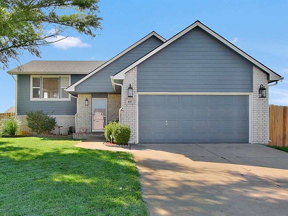 Original owners, kids raised & ready for a life-style change, can be flexible on closing and possession date. Privacy fenced, corner lot at entry to cul-de-sac. Walk 1 block to the neighborhoodâs special sidewalk short-cut connecting to the HS parking lot where shuttle buses to Primary, Elementary and Middle schools are available. Welcome to Country Walk and the peace and quiet at the NE corner of semi-rural Mulvane, just a short hop on Rock Rd from thriving Derby and on through to Wichita. The convenience of nearby amenities to this away-from-the-hustle-and-bustle AND just-off-the-beaten-path place where the best of both worlds meet could truly surprise you! Numerous improvements/updates make this home move-in ready for stress-free living. In 2017: New roof, and all exterior siding removed and moisture barrier wrap added and siding replaced with SmartSide, trim added at all windows and caulked, exterior painted; new deck support posts and floor; 16 x 10 storage shed added; Kitchen remodeled with granite counter-tops, tile back-splash, new sink & faucet, and new wood-look luxury vinyl floor in both Kitchen & Dining; new light fixtures in Kitchen & Dining; updated Hall Bathroom with new fixtures and both Hall Bathroom and Master Bathroom with new grouted luxury vinyl tile. All new stainless steel Kitchen appliances within 3 yrs. Trane AC is 7 yrs old. Family Room and lower level hallway just painted. Wood laminate floor for Living Room and hallway to bedrooms added 6-7 yrs ago. House has a security system that can be remotely armed/disarmed, plus a (negotiable) separate video/audio surveillance system at front and back doors, which allows communication with someone at the door via cell phone. Some of the fence is brand new. And a lush, green lawn nourished by the irrigation well ($5k to drill) and sprinkler system! All window blinds remain, curtains negotiable.