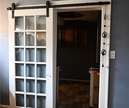 One of the standout features of this home is the charming barn door that leads into the kitchen and the vintage doors that lead to the outside porch, a perfect place for morning coffee.