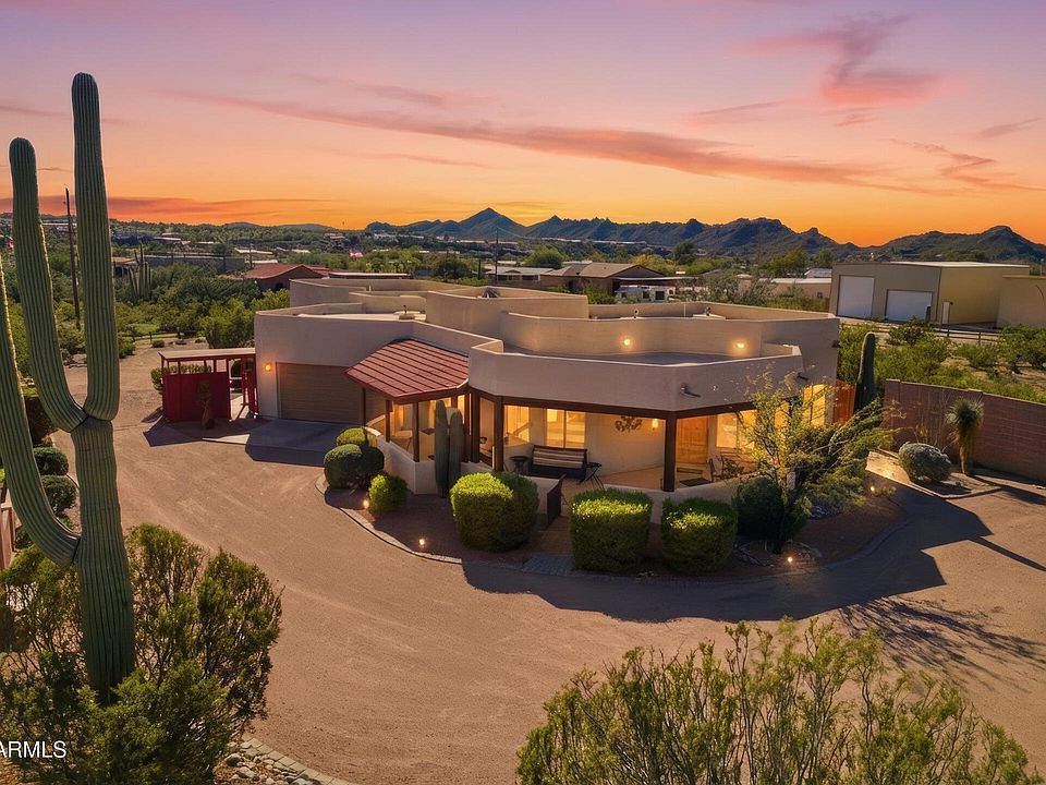 Custom Santa Fe-style furnished home perfectly positioned on a secluded 1.33-acre lot, surrounded by majestic mountain views in every direction. Designed for both comfort and functionality, this home features 3 bedrooms, 3 bathrooms, and a spacious great room that flows seamlessly into the dining area, ideal for entertaining and everyday living. The kitchen offers an abundance of solid wood cabinetry, large drawers, a center island, and beautiful view windows. One of the standout features is the OVERSIZED 4-car garage complete with built-in cabinets, perfect for a workshop, toys, or storage most only dream of. A fun and flexible ''It's 5 O'Clock Somewhere'' room adds extra space for a game room, hobby area, bar, or creative retreat. Sellers are including most tools in the garages. Step outside to the expansive covered patio that wraps around the front of the home, providing the perfect place to relax and take in the breathtaking desert and mountain scenery.