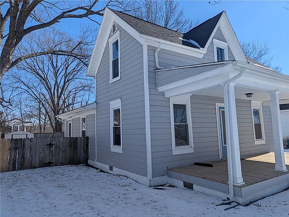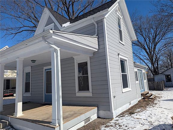 Charming two story home with some beautiful wood floors and updated kitchen is located less than a block off of Oak St., the main street in Lathrop. Walking distance to conveniences such as the post office, coffee shop, hair/nail salons, bank, and park to name a few. Elementary and middle school are just a few blocks away. This home had the old rock foundation replaced in 1999. The full roof and gutters were replaced in 2022 with a 35 year warranty which is transferrable to the new owner. HVAC and water heater are three years old. Newer windows. Upper level is set up as a master suite with landing area and closet between the bathroom and bedroom. There is an alley behind the property that could be utilized for access if you would like to put up a detached garage per city codes and restrictions. Privacy fence in back. There is a small storage shed on the property. Enjoy small town living with easy access to I-35 for commuting.