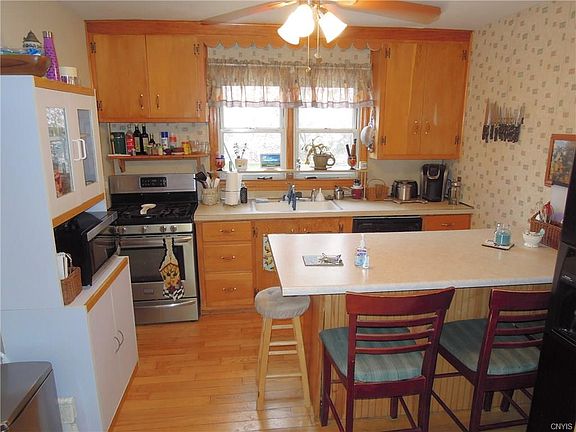 North Syracuse village cape cod home. 3 or 4 bedrooms & 2 full updated baths! Eat-in kitchen with peninsula & breakfast bar. All appliances including washer/dryer stay. Hardwood floors and lots of built-ins for great character. Huge 215' deep fully fenced yard. Partly finished lower level has staircase entry from inside the house and through the attached garage. Large deck was built to support hot tub. Updated architectural roof, most newer windows, updated furnace, AC & water heater. New driveway, both binder & top coat. Storage Shed. Basic STAR could save $720.