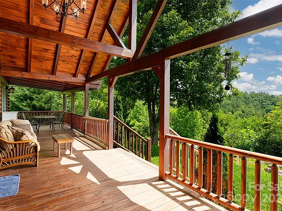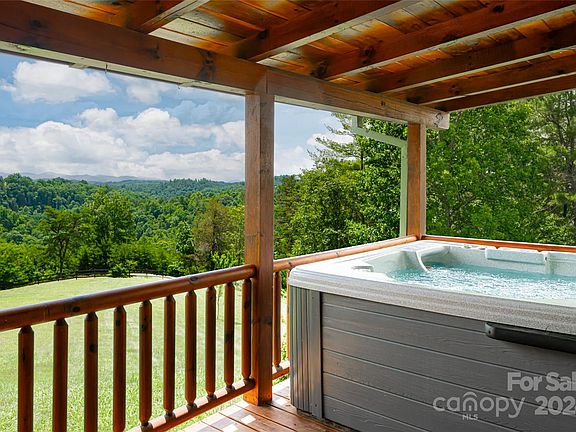 Welcome to Highland Creek, a 3 bed, 2.5 bath log cabin nestled on 3.94 acres of serene landscape, offering long range mountain views. Step inside to an open floor plan highlighted by a vaulted ceiling with rustic beams and a statement stone fireplace. The kitchen is a chef's delight, boasting a large island, stainless steel appliances, and granite countertops. A large primary suite features two walk in closets, double vanities, a jetted tub, and walk-in shower. Two guest bedrooms provide ample space for comfort and relaxation. Enjoy abundant outdoor living space with a covered front porch, expansive covered back deck, hot tub, and fire pit. The gentle and pristine acreage is comprised of three total parcels allowing for future expansion if desired. A conditioned shed is ideal for storage or a studio workshop. Fiber optic internet provides optimal connectivity. Located in a gated community, this cabin is just a short drive to Asheville and the charming towns of Weaverville and Marshall.