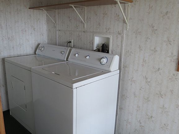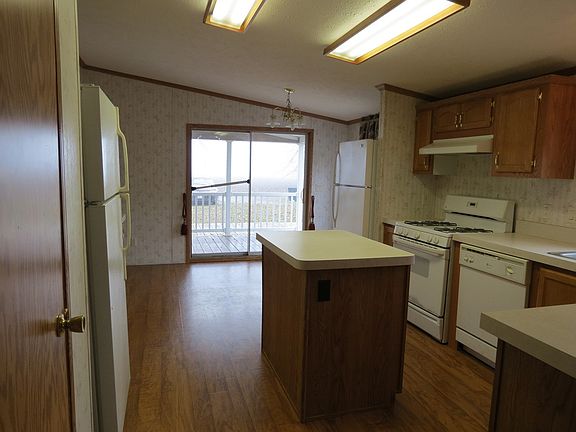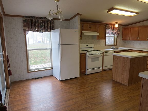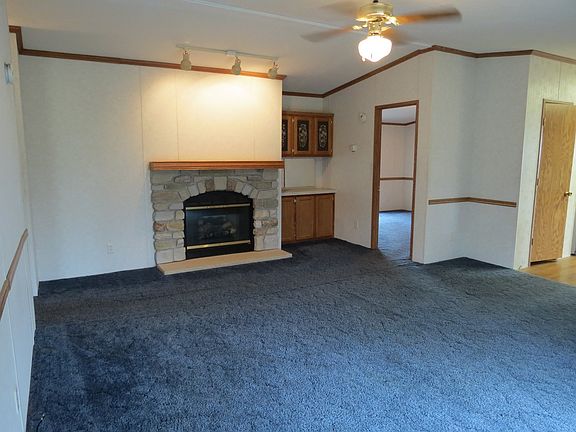 Split bedroom design in the inviting manufactured home! Master bedroom with walk-in closet and adjoining bath on one end and 2 bedrooms on the opposite end. Gathering room in the middle with a gas fireplace and display cabinet. The eat-in kitchen has an island work station & a slider door to the covered front porch & deck that surrounds the house! All appliances! 21 X 18 outbuilding with overhead door.