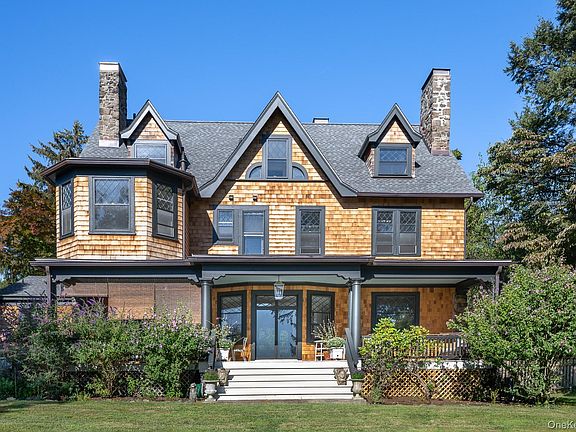 Nestled on a rare stretch of Hudson River shoreline in Upper Nyack, this timeless residence offers over 120’ of direct river frontage, expansive views, and a uniquely welcoming character. Originally commissioned in 1905 as a summer retreat for a Broadway actress, the home has only been owned by four families in over a century. With its grand entry hall, soaring ceilings, four wood-burning fireplaces, and flowing floor plan, it offers both elegance and an unexpected warmth. While impressive in scale, the home feels grounded—visitors often describe it as “friendly,” and after a single visit, you’ll understand why. The main floor offers multiple gathering and working spaces, including living room, formal dining room, music room/study, and a butler’s pantry leading to a functional kitchen ready for your next vision. The second floor features four spacious bedrooms and two full baths with panoramic river views to the east.The finished attic has two additional bedrooms, full bath and a large open space with peaked ceiling and projector screen, ideal for movie nights, creative pursuits, or a tranquil yoga studio. Updates abound, from new electric panels, roof, and shingle siding to three renovated bathrooms and high-end lighting fixtures throughout the house. Outdoors, a deep river-facing veranda is the perfect perch for sunny mornings, dramatic storms, or watching bald eagles cruise above the water. Beyond the main lawn, wooden stairs lead to a private stretch of riverfront beach, a rare feature. Ideal for kayaking, dog walks, swimming, or riverside reading, this lower yard, known as “the down-below”, offers opportunity for a mooring, a future dock, or landscaped waterfront garden. The 1.6-acre property offers a rare mix of open lawn, cliffside views, and cultivated garden spaces. Step into town for music or coffee, walk the Hook Mountain trails, or just listen to the wind through the trees. City-adjacent, nature-immersed, creatively open. This is not just a house, it’s an invitation.