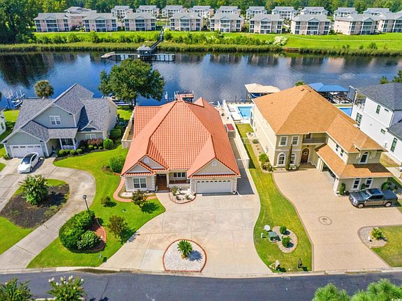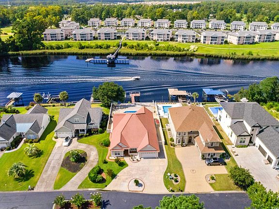 Discover this custom 2,820 heated sq ft (3,906 under roof) Mediterranean style home, built in 2005 on a quiet cul-de-sac with spectacular Intracoastal Waterway views. Perfectly blending comfort and coastal luxury: Inviting Exterior & Entry: Circular drive, 2-car garage with workshop, parking for 10+, lush landscaping with irrigation, and a 500-gal propane tank. Elegant Interior Living: Tile floors throughout (bamboo in office), radiant heated floors in great room, kitchen, dining & primary suite, vaulted ceilings, remote skylights, and a cozy ventless fireplace. Spacious great room flows effortlessly into the kitchen and dining area. Primary Suite & Office: Tranquil primary retreat with heated floors, sitting area second office space and spa-like Jacuzzi bath. Dedicated office Additional Living Spaces: Two additional bedrooms, plus a comfortable home office with bamboo flooring, ideal for work-from-home.. Outdoor & Waterfront Amenities: 16 × 32 ft in-ground pool with adjacent full bath access. Private boat dock with liftâ€â€perfect for boating or sunset views. Smart Systems: Tankless hot water heater and water distribution system Convenient to Broadway, Coastal Grand Mall, Top Golf and all of the entertainment and attractions that Myrtle Beach has to offer.