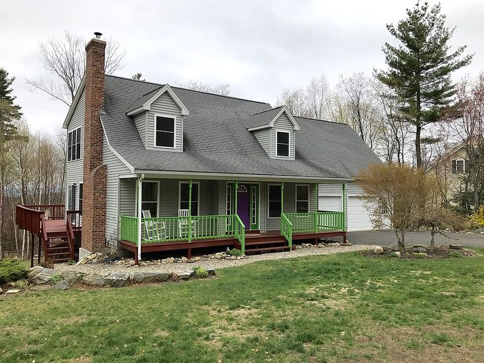 Beautiful southwest views of the Holyoke Range from the deck and wall of windows in kitchen, dining area, and master bedroom. This 2003 Cape has a large farm-style front porch; open living, dining, and kitchen area perfect for entertaining; an in-law suite with full kitchen, bath, and private entry; and a walk-out basement with full-sized windows just waiting to be finished! Right inside the main entrance is a large first-floor office/library with built-in shelving and upstairs an open sitting room offering great views of the Range. The master suite has windows galore, private bath, closet, and adjacent access to sitting room. Located on a non-through road there are miles of wooded trails for hiking & skiing yet you'll find Amherst center and area colleges a convenient distance away. Other features include a 2-car garage, central air, and a soapstone woodstove centrally located in the living room. A great place to call home! No showings until Open House, Sunday, May 7th, from 11 to 1.