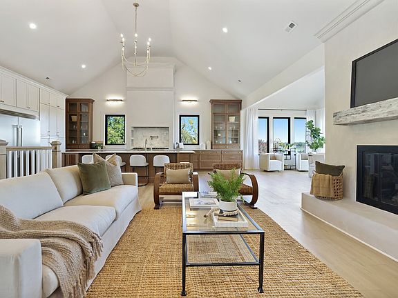 Every inch of this home was professionally designed with luxury in mind, showcasing high-end cabinetry, designer lighting, custom tile, and premium plumbing fixtures. The chef’s kitchen impresses with Taj Mahal quartzite countertops, custom cabinetry, vaulted ceilings, a handcrafted hood, a 60-inch professional range, and a matching 60-inch refrigerator.